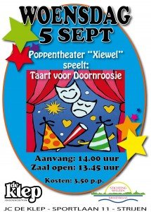 Woensdag 5 september speelt Poppentheater “Xiewel” uit Dordrecht de voorstelling “Taart voor Doornroosje” in Jongerencentrum De Klep in Strijen.
