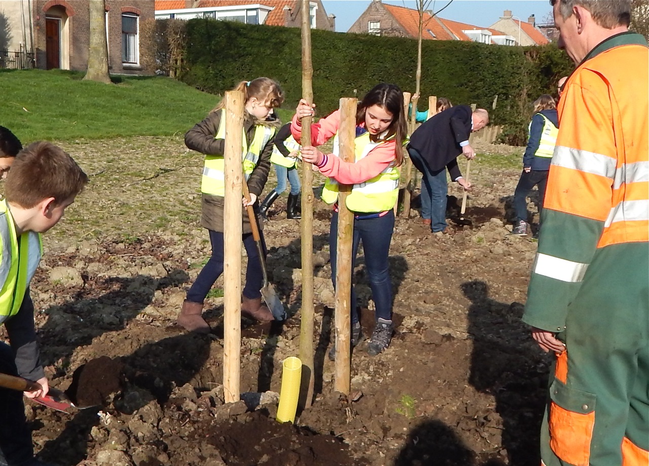 pal naast de school vier al flink uit de kluiten gewassen bomen geplant; twee walnoten en twee platanen. Vorig jaar sneuvelden tijdens een storm de oude wilgen, die bij het schoolplein stonden. Nu werden er dus walnoten en platanen geplant, omdat die een eindje verderop ook langs de dijk staan. Dat er vier bomen werden aangeplant was trouwens ook symbolisch. Er zijn namelijk vier instellingen in het gebouw gehuisvest; Het Anker, De Regenboog, De Spetters en peuterspeelzaal
