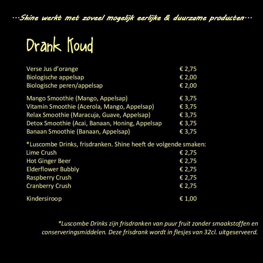 *Hetgeen dat SHINE uit serveert is voor bijna 100% zelf gemaakt. Daarnaast probeert SHINE zoveel mogelijk met biologische producten te werken.*
