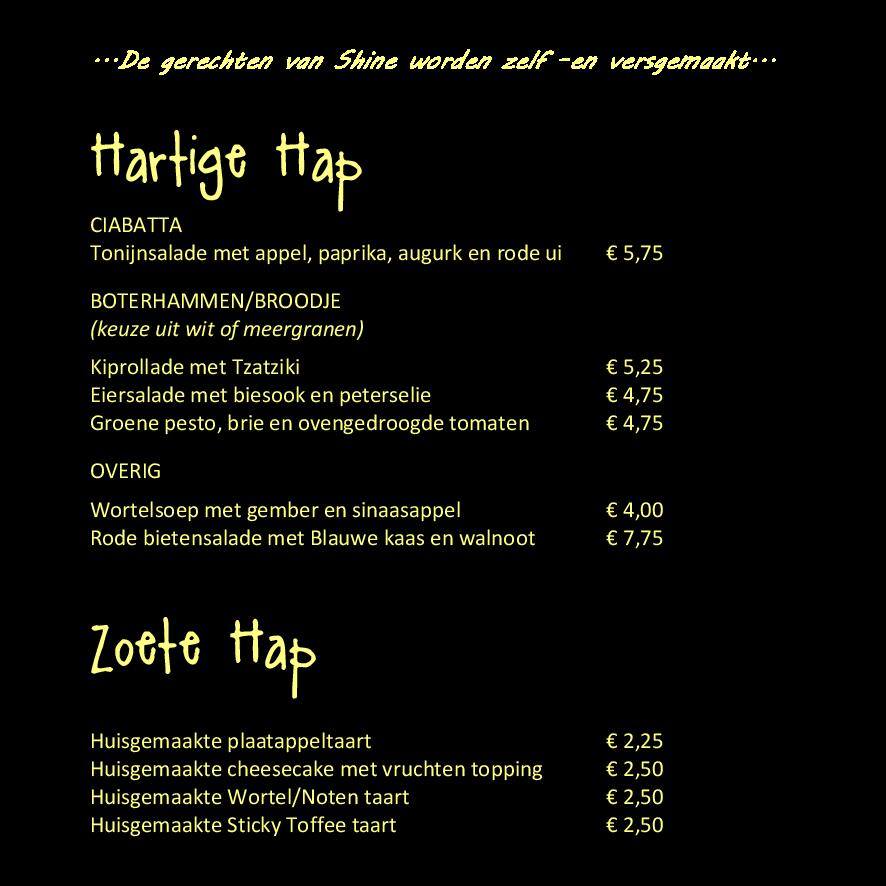 Shine zal hoog waarschijnlijk bij de wisselende Specials van de Week u de mogelijkheid bieden om een gedeelte van de Nieuwe Kaart alvast te proeven. Via onze Facebooksite: www.facebook.com/SHINEfoodendrinks blijft u op de hoogte van deze ontwikkelingen.