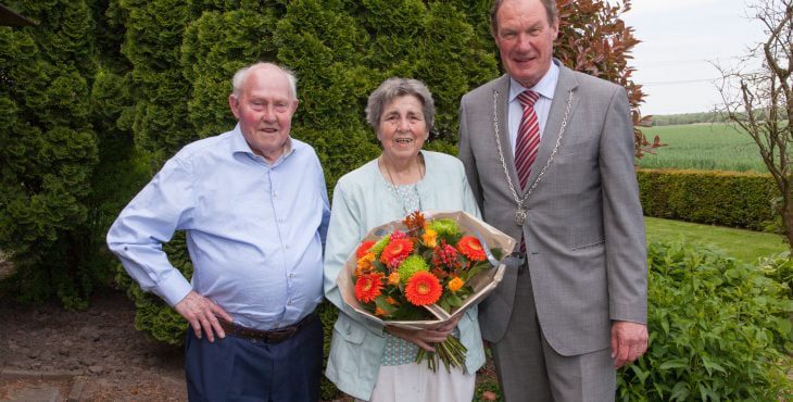 STRIJEN – Maandag 22 mei vierden Jo en Pie Verschoor hun 60-jarig huwelijk. Burgemeester Waaijer bracht het diamanten paar zijn welgemeende felicitaties over, at gezellig een gebakje mee en liet een mooie bos bloemen achter.