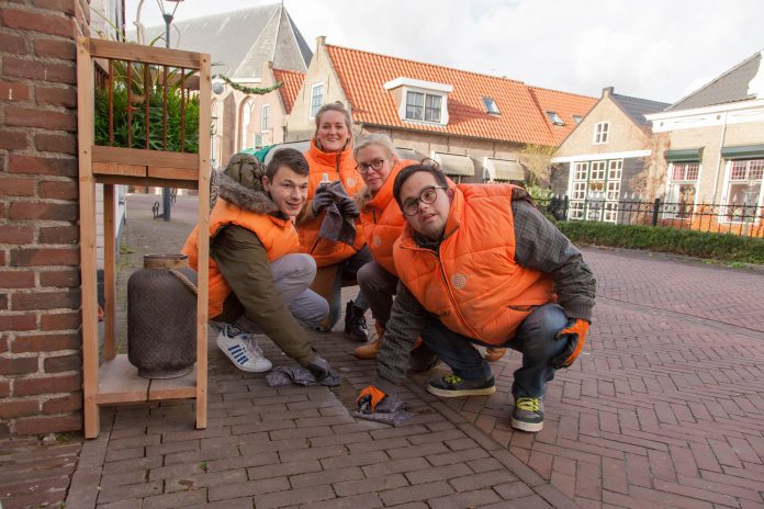 Met grote zorg wordt eerst het grove vuil van de messing plaatjes geveegd met een zachte borstel. Vervolgens gaan de mensen van dagverzorging Het Molenschaer héél secuur in de weer met koperglas en zachte poetsdoeken. Om vervolgens, in hun spetterend oranje gehulde bodywarmers, vol trots het glimmende resultaat te bekijken.
