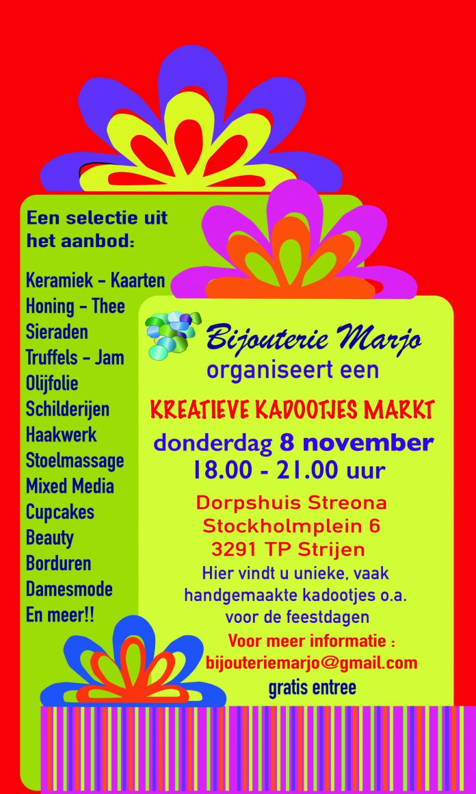 Strijen – Op donderdag avond 8 November organiseert Bijouterie Marjo een Kreatieve Kadootjesmarkt in dorpshuis Streona te Strijen!