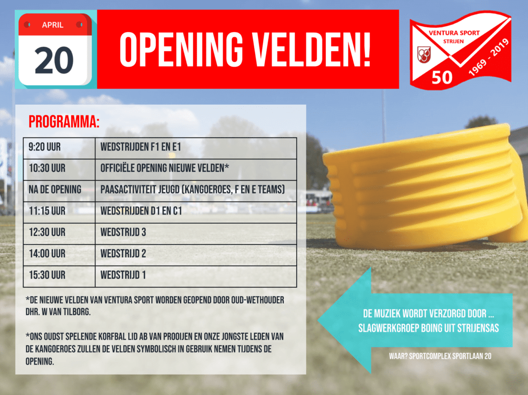 De opening van de velden wordt verricht door oud-wethouder Wilko van Tilborg. Hij krijgt hierbij hulp van het oudst-spelende Ventura Sport lid, Ab van Prooijen, en de jongste korfballers van de kangoeroes. De muzikale begeleiding wordt verzorgd door slagwerkgroep BOING.