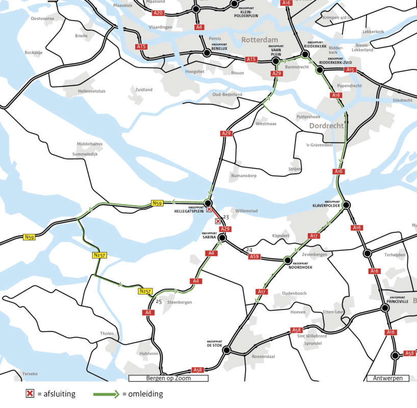 • verkeer op de A29 richting Fijnaart, Heijningen, Dinteloord en Willemstad wordt omgeleid via de N59, N257 en de A4