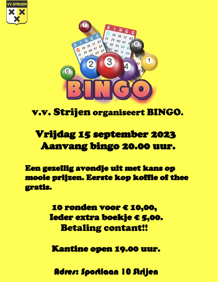 v.v. Strijen organiseert vrijdagavond 15 september weer een BINGO. Aanvang bingo 20.00 uur.Een gezellig avondje uit met kans op mooie prijzen. Eerste kop koffie of thee gratis.
