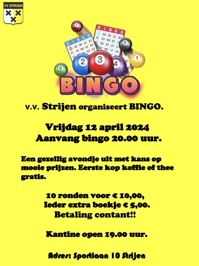 v.v. Strijen organiseert voor de bingo liefhebbers op vrijdagavond 12 april weer een gezellige bingoavond! De aanvang van de bingo is om 20.00 uur.