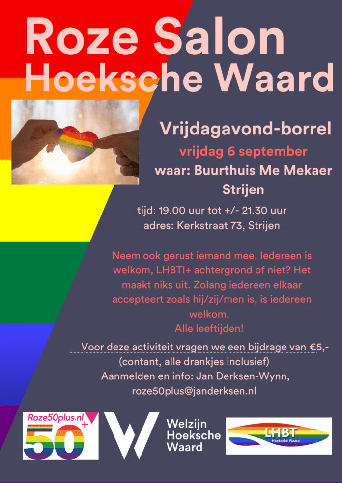 Vrijdag 6 september luiden we de zomervakantie uit met een regenboogborrel! Tijdens dit leuke initiatief van Roze 50+, Welzijn Hoeksche Waard en LHBTHW zijn we deze keer weer welkom in Buurthuis Me Mekaer in Strijen. LHBTI-ers, buren, vrienden, familie en iedereen die geïnteresseerd is (van alle leeftijden) zijn van harte welkom tussen 19.00 uur en ongeveer 21.30 uur om gezellig een drankje te drinken op deze vrijdagavond-borrel.