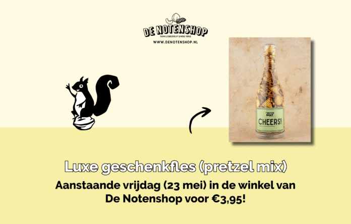Wil je iemand bedanken of ben je op zoek naar een speciaal cadeau voor een feestelijke gelegenheid? Met deze luxe geschenkfles vol pretzels, ga je gegarandeerd iemand blij maken! Scoor hem aanstaande vrijdag (23 mei) voor maar €3,95 in de winkel van De Notenshop!
