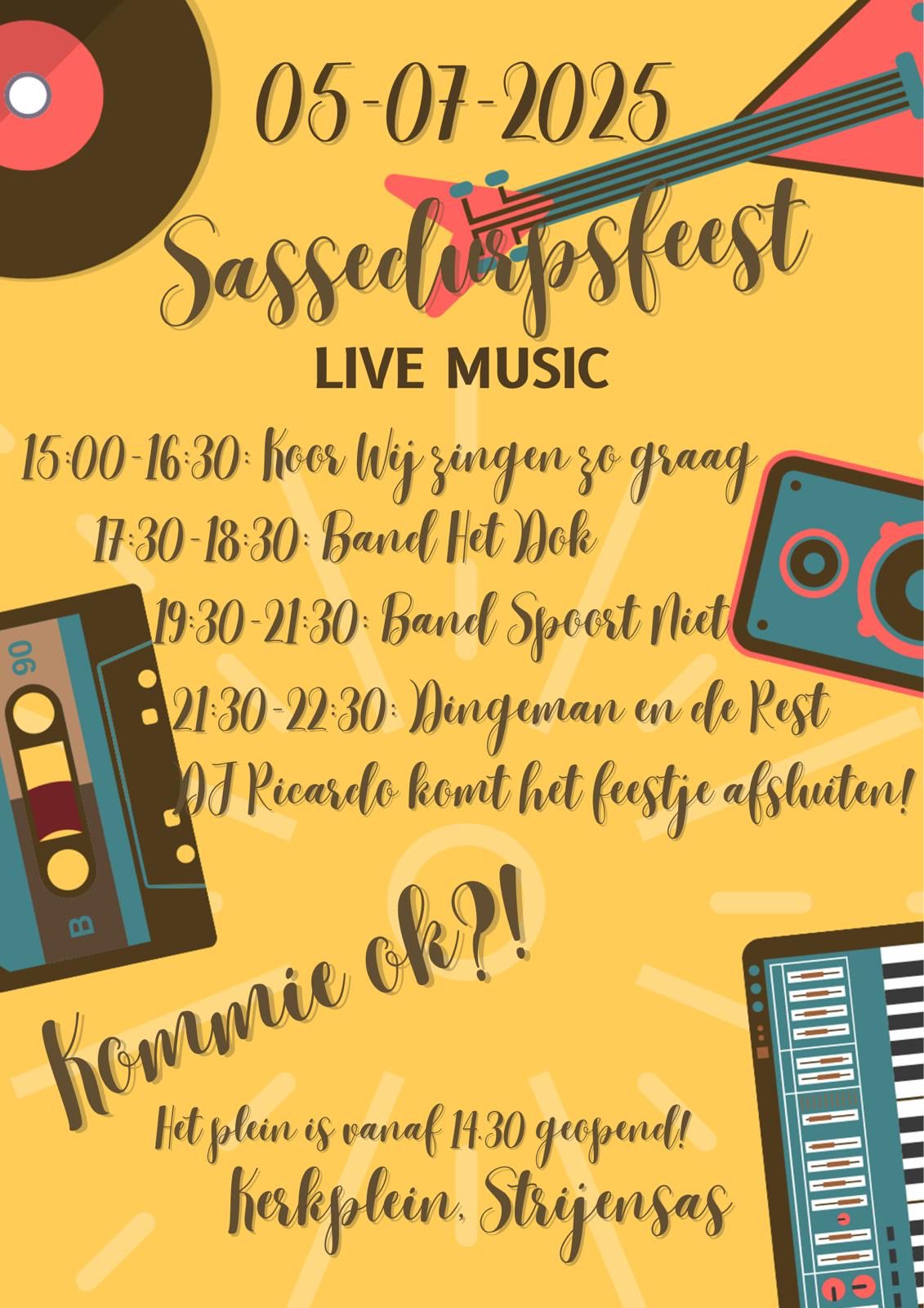 Ook dit jaar staat Strijensas weer in het teken van het Sassedurpsfeest, dat op zaterdag 5 juli 2025 plaatsvindt op het Kerkplein. De weersvooruitzichten zijn voorzichtig positief, en de organisatie kijkt dan ook uit naar een sprankelende editie vol muziek en gezelligheid!
